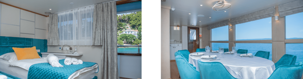 Omdat er zo weinig kajuiten op de M/Y Adriatic Blue zijn, geniet je in alle rust van de faciliteiten. Er reizen maximaal 36 passagiers mee. En die profiteren van een zonnedek met bubbelbad, een panoramische loungebar en een gastronomisch restaurant. Wanneer het schip voor anker ligt, spring je vanop het platform achteraan zelfs rechtstreeks in zee. Zit je eerder met vragen over de volgende bestemming? Een enthousiaste, achtkoppige crew staat dag en nacht voor je klaar. Extra handig: de bemanningsleden spreken Frans én Nederlands.