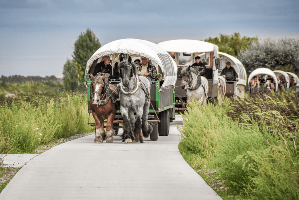 Oostduinkerke is de habitat van het trekpaard. Met de garnaalvissers op hun rug trekken ze de Noordzee in, op zoek naar de grijze garnaal. Al stappen ze af en toe ook door de straten. Dan trekken ze een comfortabele huifkar voort en leiden ze je rond in de charmante badplaats.