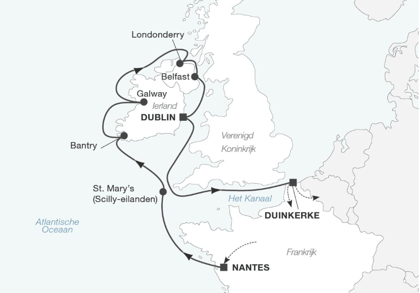 Met z’n woeste heiden, authentieke landhuizen, ruige kustlijnen en groene heuvels spreekt Ierland tot de verbeelding. Tijdens deze cruisetocht toont het land zich van z’n meest poëtische en filmische kant. Je vaart rondom het hele eiland en houdt halt in vier iconische havensteden. Maar niet voordat je eerst even voet zet op de Scilly-eilanden. Deze archipel nestelt zich tussen Europa en het Verenigd Koninkrijk. Je struint er langs witte zandstranden en blauwe lagunes.