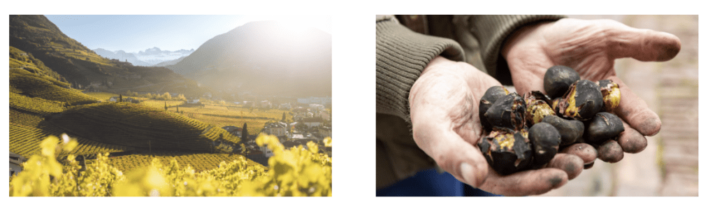 C’est dans des vignobles baignés de soleil qui s’agrippent aux coteaux en pente que poussent certains des vins les plus typiques d’Italie. Le Sud-Tyrol compte pas moins de 20 variétés de raisins sur un territoire relativement petit, allant des vins blancs frais comme le pinot grigio et le gewürztraminer au rouge corsé et raffiné que l’on appelle Lagrein, un cépage qui ne pousse que dans le Sud-Tyrol.