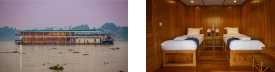 Met slechts 36 passagiers en een diepgang van amper negentig centimeter kan de houten R/V Kindat Pandaw de grillige zandbanken van de Brahmaputra veilig ronden. Het schip telt achttien kajuiten op twee dekken, een open bistro met binnen‑ en buitentafels en royale dekruimte voor panoramische observatie.