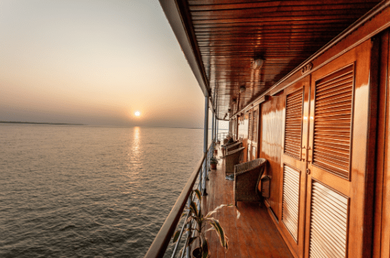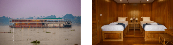 Avec seulement 36 passagers à bord et un tirant d’eau de à peine 90 centimètres, le R/V Kindat Pandaw, construit en bois, peut naviguer en toute sécurité à travers les bancs de sable imprévisibles du Brahmapoutre. Le bateau dispose de dix-huit cabines réparties sur deux ponts, d’un bistro ouvert avec des tables en intérieur et en extérieur, ainsi que de vastes espaces extérieurs offrant une vue panoramique idéale pour l’observation.