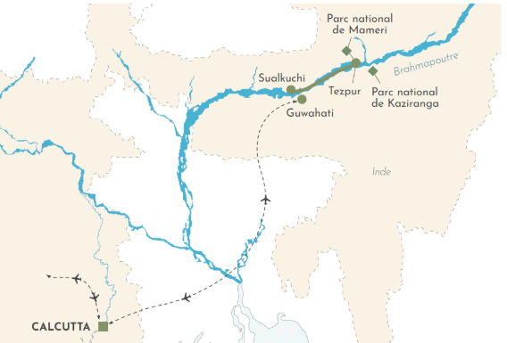 Ce voyage de quatorze jours débute à Calcutta et remonte le fleuve à travers des plantations de thé, des îles fluviales et des sanctuaires jusqu’à Guwahati. Parmi les moments forts : une journée complète de safari en jeep dans le parc national de Kaziranga, berceau du rhinocéros unicorne indien et l’un des territoires les plus fortement peuplés de tigres au monde, une visite du parc national de Nameri, réputé pour sa richesse ornithologique, et une escale sur l’île sacrée de Majuli, haut lieu spirituel du fleuve.