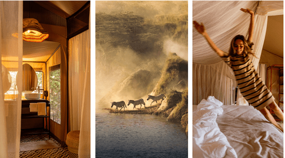 Dans le Masai Mara se trouve l’Emboo Camp, un camp de safari nouvelle génération. Les tentes sont dispersées sur un vaste terrain non clôturé, délimité uniquement par une rivière, ce qui permet aux animaux de se déplacer en toute liberté. On y vit des moments inattendus : des hippopotames passent devant votre tente au réveil tandis que des zèbres apparaissent dans la lumière du matin, et tout cela est à voir depuis votre lit. Vous n’aurez aucun mal à opter pour une grasse matinée, avec, sous vos yeux, un spectacle vivant.