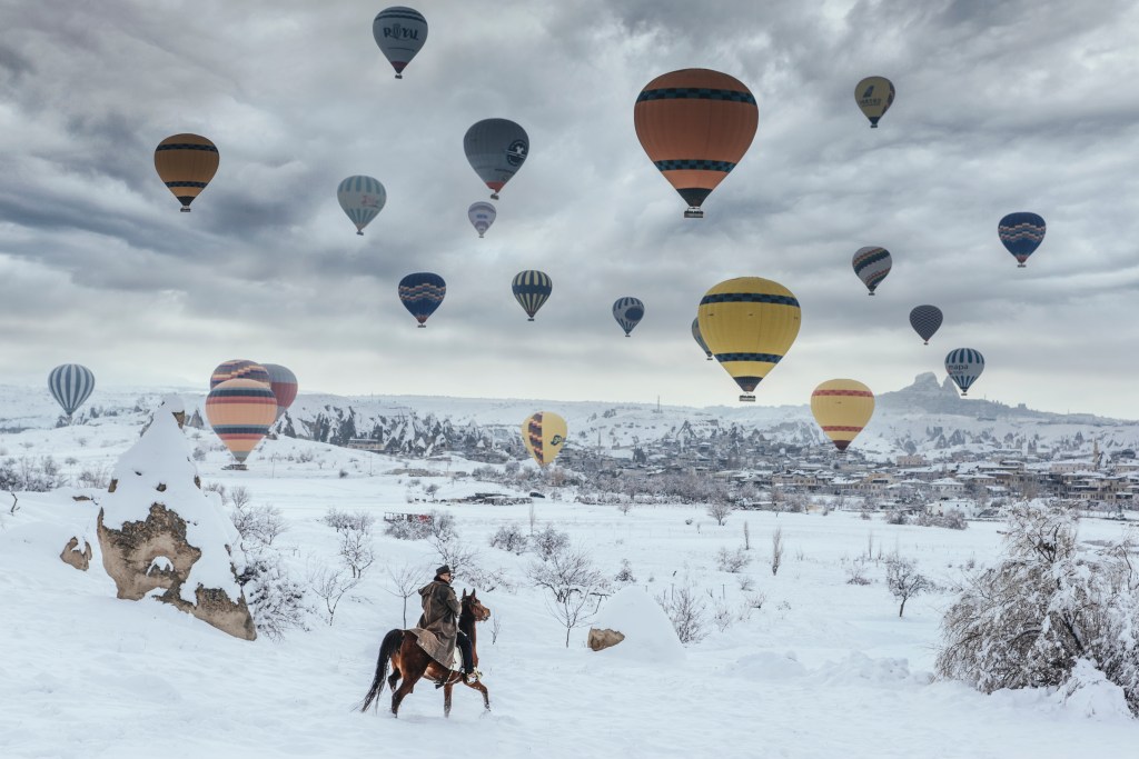 Cappadocië is pure magie, zeker in de winter. Sneeuw bedekt de iconische fairy chimneys, terwijl bij zonsopgang tientallen luchtballonnen langzaam opstijgen. Overnachten doe je in een authentiek grothotel, mét open haard.
