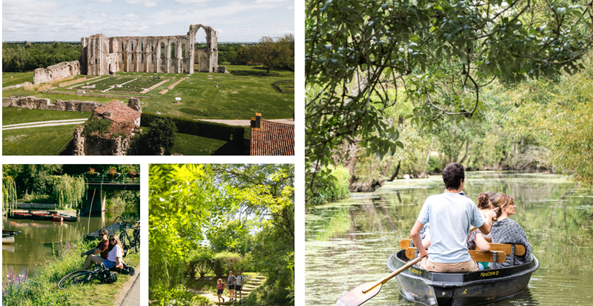 Wie liever op het droge blijft, fietst langs de kanalen of kiest voor een sportievere tocht met een elektrische all-terrainstep. Wandelaars trekken door natte graslanden en stiltegebieden met een opvallend rijke biodiversiteit. Tot de bekendste routes behoren de Route d’Eau in Doix-lès-Fontaines en Les Nattes in Aziré, Benet. Ook de gemeenschappelijke graslanden van het Marais Poitevin, waaronder het Regionaal Natuurreservaat van Le Poiré-sur-Velluire, zijn een bezoek waard. Dit uitzonderlijk rijke natuurgebied herbergt 98 plantensoorten en 163 vogelsoorten, waarvan vele zeldzaam en beschermd zijn. Wil je een stap terug in de tijd zetten? De ruïnes van de majestueuze Abdij van Maillezais nemen je mee naar het verhaal van de mensen die het Marais Poitevin hebben vormgegeven.