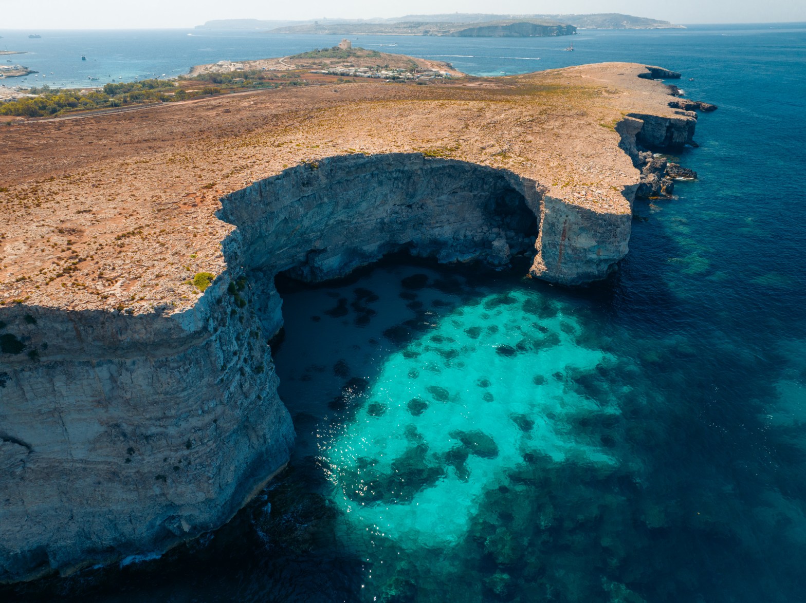 Felrood tegen een zacht okerkleurig landschap. De toren lijkt klein, tot je de uitgestrekte kustlijn en het uitzicht richting Comino ziet.