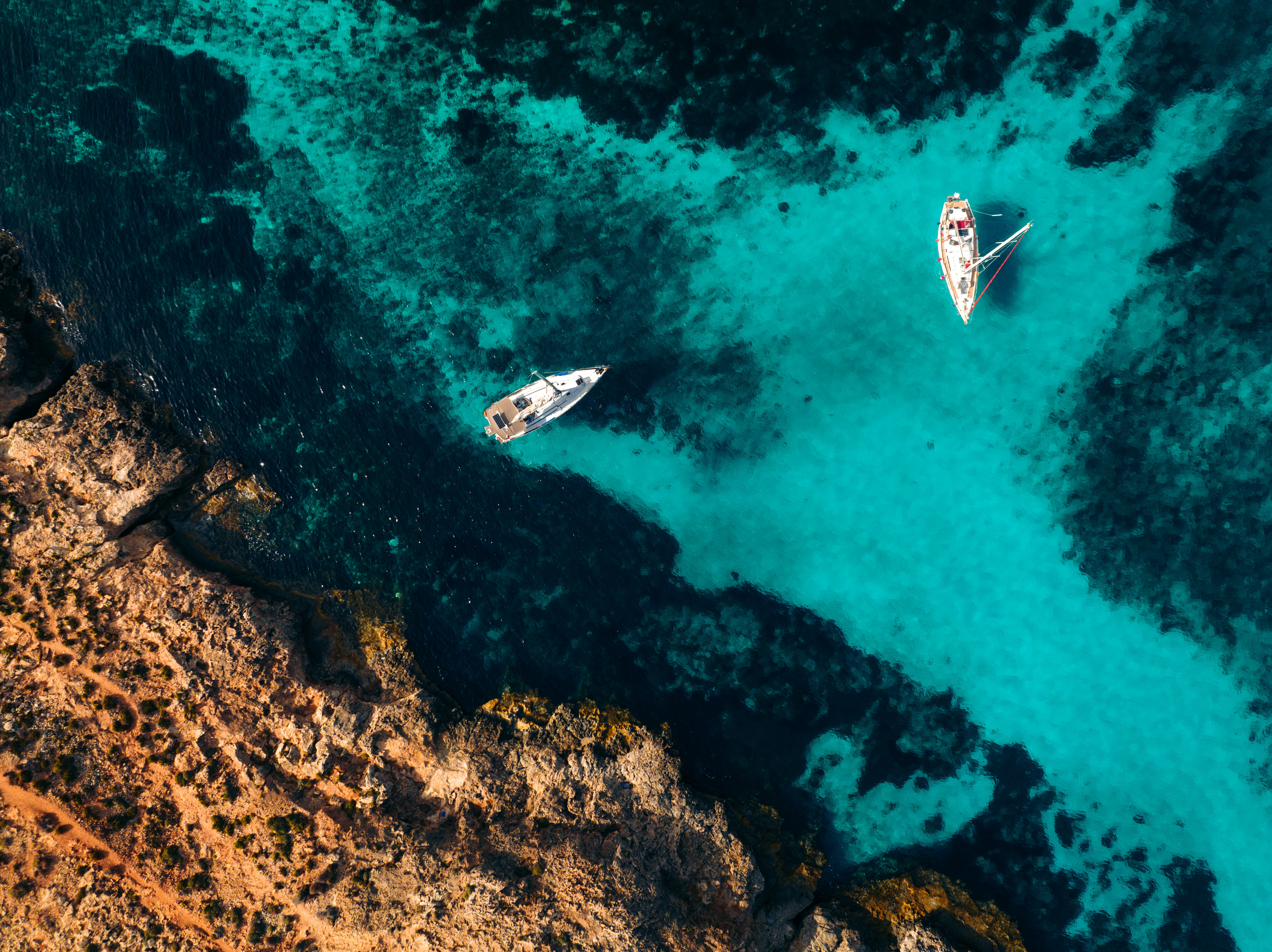 Turquoise water dat overloopt in wit zand en rotsen. Vanuit de lucht lijkt het bijna Caribisch, maar dan gewoon in Europa.